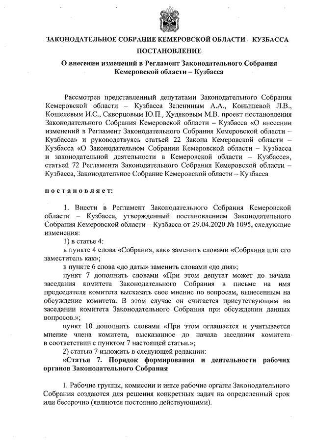 Постановление Законодательного Собрания Кемеровской области - Кузбасса от 23.12.2025 N 1294 "О внесении изменений в Регламент Законодательного Собрания Кемеровской области - Кузбасса"