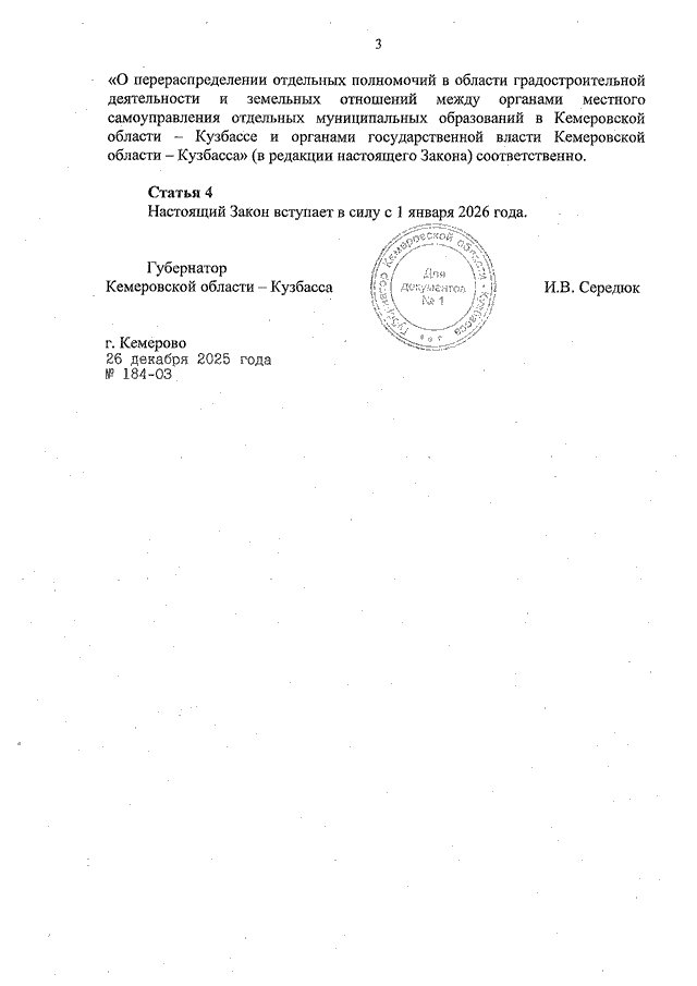 Закон Кемеровской области - Кузбасса от 26.12.2025 N 184-ОЗ "О внесении изменений в некоторые законодательные акты в сфере градостроительства" (принят Законодательным Собранием Кемеровской области - Кузбасса 23.12.2025)