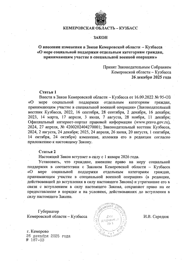 Закон Кемеровской области - Кузбасса от 26.12.2025 N 187-ОЗ "О внесении изменения в Закон Кемеровской области - Кузбасса "О мере социальной поддержки отдельным категориям граждан, принимающим участие в специальной военной операции" (принят Законодательным Собранием Кемеровской области - Кузбасса 26.12.2025)