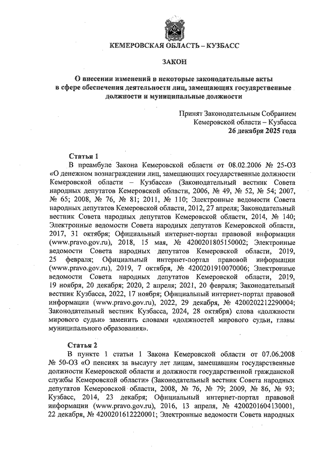 Закон Кемеровской области - Кузбасса от 26.12.2025 N 188-ОЗ "О внесении изменений в некоторые законодательные акты в сфере обеспечения деятельности лиц, замещающих государственные должности и муниципальные должности" (принят Законодательным Собранием Кемеровской области - Кузбасса 26.12.2025)