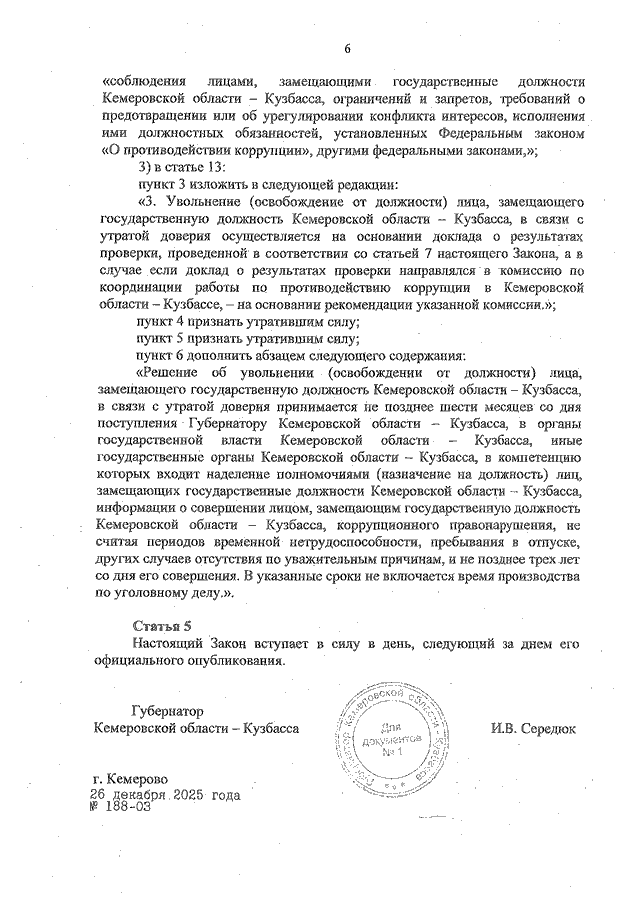 Закон Кемеровской области - Кузбасса от 26.12.2025 N 188-ОЗ "О внесении изменений в некоторые законодательные акты в сфере обеспечения деятельности лиц, замещающих государственные должности и муниципальные должности" (принят Законодательным Собранием Кемеровской области - Кузбасса 26.12.2025)
