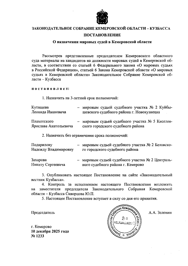 Постановление Законодательного Собрания Кемеровской области - Кузбасса от 10.12.2025 N 1233 "О назначении мировых судей в Кемеровской области"