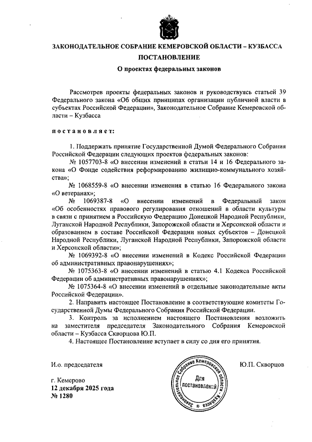 Постановление Законодательного Собрания Кемеровской области - Кузбасса от 12.12.2025 N 1280 "О проектах федеральных законов"