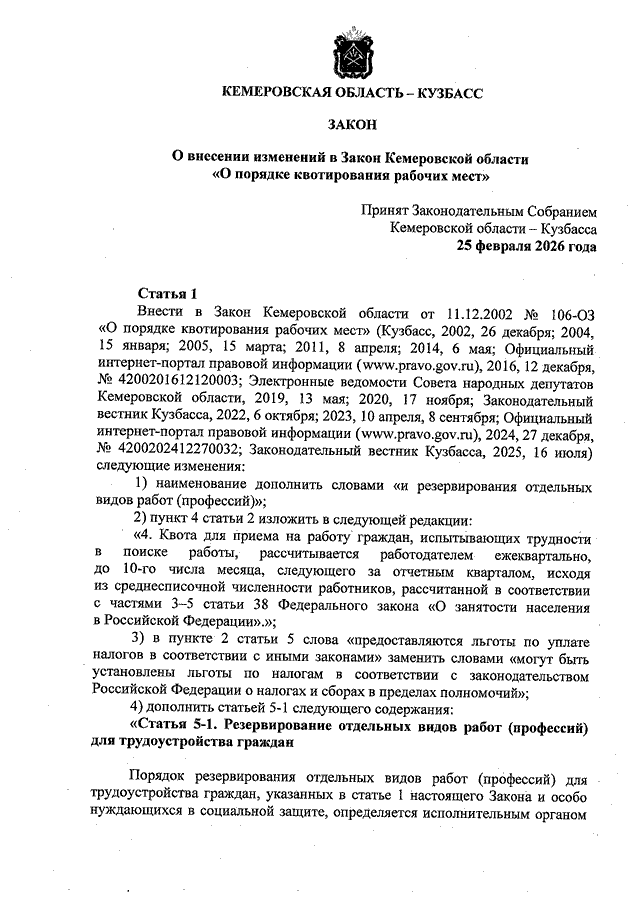 Закон Кемеровской области - Кузбасса от 25.02.2026 N 10-ОЗ "О внесении изменений в Закон Кемеровской области "О порядке квотирования рабочих мест" (принят Законодательным Собранием Кемеровской области - Кузбасса 25.02.2026)