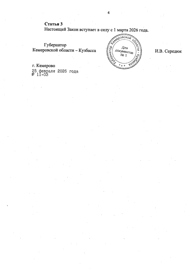 Закон Кемеровской области - Кузбасса от 25.02.2026 N 11-ОЗ "О внесении изменений в статью 7 Закона Кемеровской области - Кузбасса "О порядке управления государственной собственностью Кемеровской области - Кузбасса" и Закон Кемеровской области "О разграничении полномочий между органами государственной власти Кемеровской области - Кузбасса в сфере земельных отношений" (принят Законодательным Собранием Кемеровской области - Кузбасса 25.02.2026)