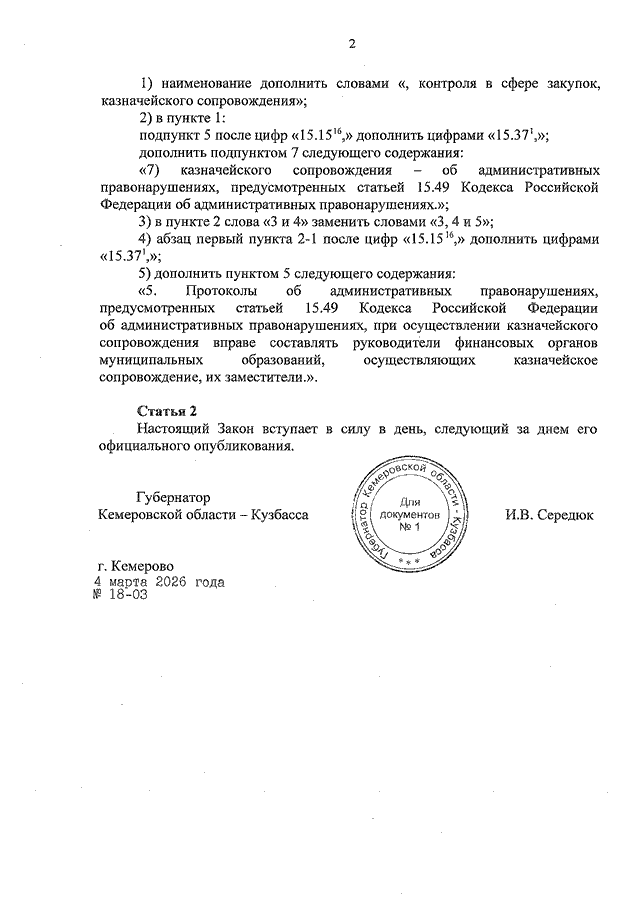 Закон Кемеровской области - Кузбасса от 04.03.2026 N 18-ОЗ "О внесении изменений в статью 64-1 Закона Кемеровской области "Об административных правонарушениях в Кемеровской области" (принят Законодательным Собранием Кемеровской области - Кузбасса 25.02.2026)