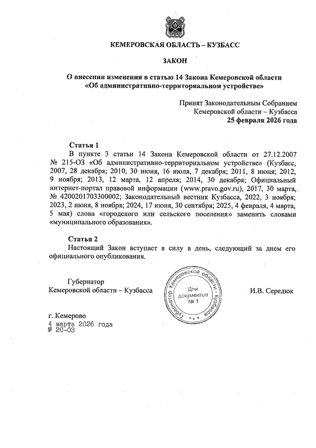 Закон Кемеровской области - Кузбасса от 04.03.2026 N 20-ОЗ "О внесении изменения в статью 14 Закона Кемеровской области "Об административно-территориальном устройстве" (принят Законодательным Собранием Кемеровской области - Кузбасса 25.02.2026)