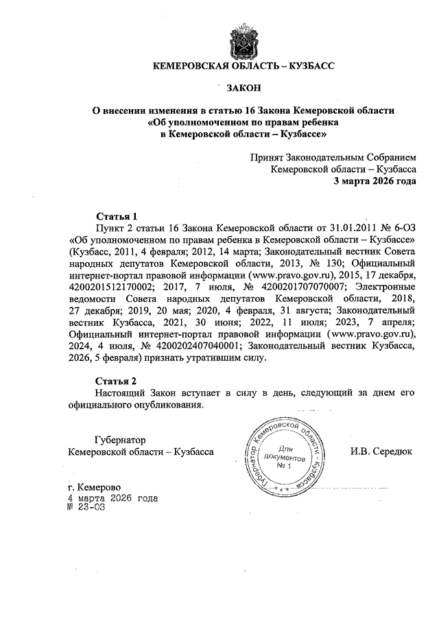 Закон Кемеровской области - Кузбасса от 04.03.2026 N 23-ОЗ "О внесении изменения в статью 16 Закона Кемеровской области "Об уполномоченном по правам ребенка в Кемеровской области - Кузбассе" (принят Законодательным Собранием Кемеровской области - Кузбасса 03.03.2026)